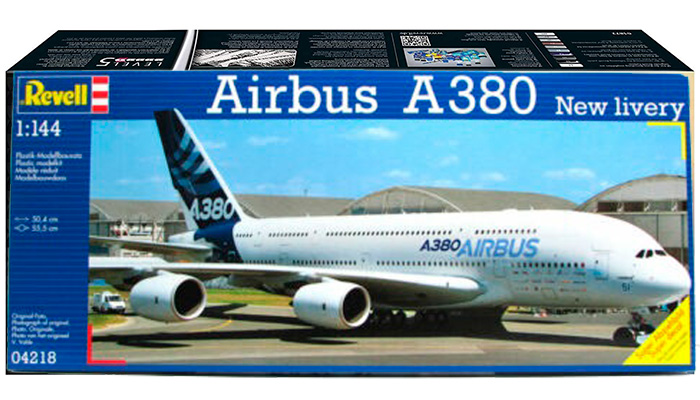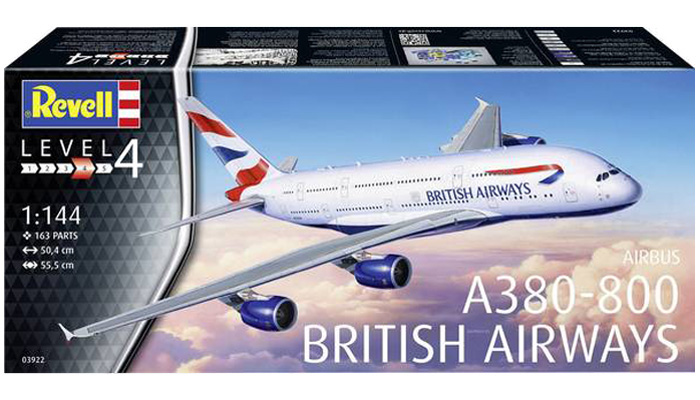 Uma réplica do modelo do Airbus A380, o maior avião comercial produzido em massa. Em 2013, a British Airways recebeu os primeiros 12 A380 a serem entregues. Na configuração padrão, ele pode transportar 469 passageiros. Superfícies estruturadas - Embarque detalhado - 22 rodas - Imitação de cockpit - Winglets
