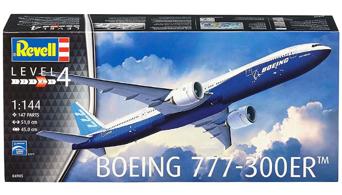 Um kit de construção de modelo do Boeing 777-300ER, uma aeronave de passageiros de longo alcance de dois motores com capacidade para até 550 passageiros. Superfícies finamente estruturadas com juntas de painel recuadas. Material rodante detalhado