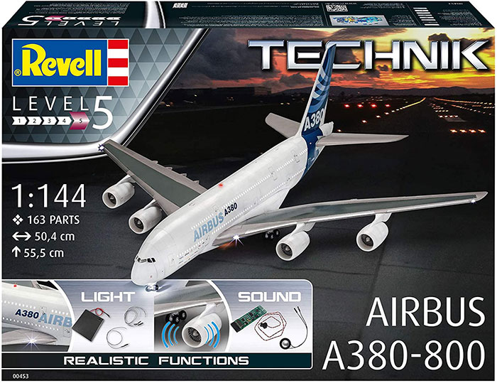 Componentes eletrônicos que são personalizados individualmente para o kit e podem ser instalados diretamente com conexões de plugue convenientes - LED para luzes de posição, luzes de pouso e iluminação da cabine - Módulo de som com comunicação de rádio e ruídos realistas do motor - Kit de modelo de plástico do Airbus A380-800 com muitos detalhes